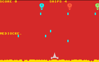 - you only get one point per level! To start each level, press 1 or 2. Then use A=Left, L=Right, SPACE=Fire to