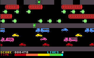 Arcade. Use joystick in Port 2. Cross the road and river, and jump into holes on river bank. There is only