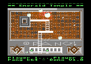 One screen shooting game. This was work done for a pitch for the C64 conversion of the coin-op game Pang.