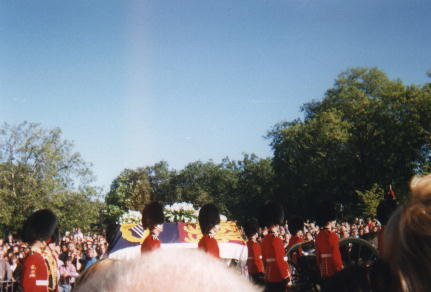 Diana's FuneralI had not fully appreciated Diana when she was alive, but one evening as I got home from a night out, I turned on the telly to see the story of the Paris car crash slowly unfold, and a sense of horror overtook me. The sense of mass sadness was new to me, but swept me up in it, as I remembered all her good points and recast any foibles as being character building. I was impressed with how quickly the funeral was arranged, with giant screens in Hyde Park for a rather large crowd, and an escort and a crowd that showed the breadth of her appeal. |