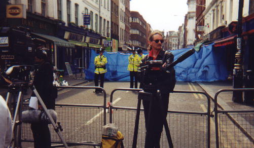 Soho BombAt 6:37pm pm on 30th April 1999, a nailbomb exploded in the Admiral Duncan on Old Compton Street, Soho, London. Andrea Dykes (27), Nick Moore (31) and John Light (35) were killed, and many others maimed and injured. The week before a bomb had blown up in Brick Lane (a Bangladeshi area) and the week before that in Brixton (a black area). That evening, I was thinking of going out, but changed my mind since I was feeling tired. This was fortunate, as otherwise I would have walked into a scene of devastation. A cute leafletter by the name of Rob would have normally been standing in front of the window, but not that day. Many people thought "It could have been me; I could have been there". Many other people were there, and would have preferred not to be. The perpetrator, David Copeland (22) was arrested a few days later, and has pleaded guilty to manslaughter but not to murder. The trial continues. Many floral tributes were placed around the area. To protect them, they were moved to a corner of Soho Square, and JJ set up a 24 hour watch to protect them from vandals, and to offer sympathy to those whose friends (like his) had been caught in the blast. He lived and slept in the square for more than two weeks, determined that they would not suffer the fate of Steven Lawrence's tributes. He was assisted in this by a few people, including a couple of old acquaintances of mine. |
