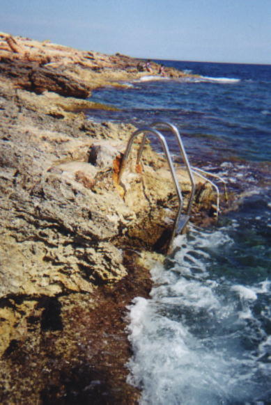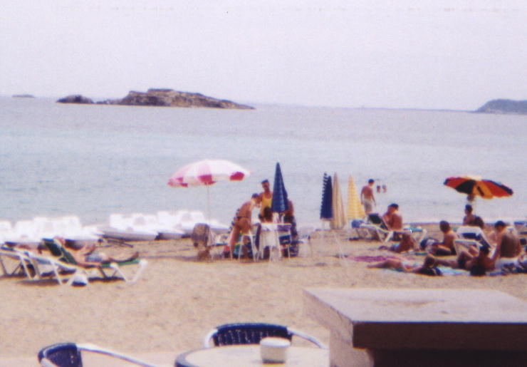 IbizaThere are a few nice beaches in Ibiza, but beyond the sand are shallow rocks with barnacles; so they can be more suited to sunbathing than swimming. The water is incredibly clear, and quite salty. The rocks were host to more adventurous sunbathers and a bar in the middle of nowhere. |