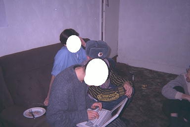 | In the mean time, here is a censored piccie of Hussy at the laptop while the party rages... You can still clearly see Philip's Russian hat :-) | |
