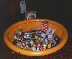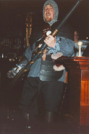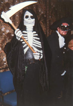 MaskeradeAt the Maskerade, lots of people really went to town on their designs. The witches were a popular choice, with many women entering dressed up with pointy hats and broomsticks. A trio from the Netherlands were getting steadily off their collective trolleys with banananana daquiris. A winning Granny Weatherwax was scarey! While there was a pantomime elephant (from Moving Pictures) the two guys who dressed as Greebo the cat picked the moment he was tranformed into a somewhat human Pirate, a very sensual character choice. And of course one of the winners was Death complete with scythe. When he failed to turn up, I suggested we perform the rite of Aske Ente, and someone else asked (a bit more clearly) for 4cc of mouse blood... Not all the people in costume entered: I saw a female and male barbarian at the banquet who I didn't recognise from the Maskerade. The bouncey castle was a popular place to hang out, and some alt.fan.pratchett supporters turned up there. The Custard Bath was reserved for the organiser, Paul Rood. |