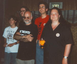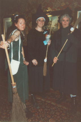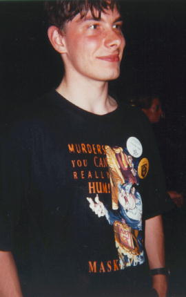 Discworld ConventionSome of you may already have heard of alt.fan.pratchett, in which case you may have heard of the L-spacer and Leo, who host lovely web pages covering the DiscWorld books. But have you seen pictures of them? Now you have... The blond in the top piccie is the l-spacer, and the cute Dutch boy underneath is Leo. A not-so-frequent poster is BarrieR, followed by Alex the eternally harassed. The other crazy kiwi in the place was trying to get everyone at the convention to sign his book - I think he succeeded, as he seemed to have enough signatures collected to qualify for the Russian presidency ;-) One soldier boy made it all the way from Bosnia to get to the conference, while some people managed to get there from "near" Coventry. Emmet and Morgon (who does not want to be referred to as "mini-Emmet") formed part of the winning team in the Unseen University Challenge, seen here with pTerry. EventsThe calender was packed full of so many events you couldn't possibly see all the ones you wanted to over the weekend. Here are a few examples of what was on offer: Slaughterathon. The Assassins guild ran a competive examination over the weekend. You were given the name of the person you had to inhume. This resulted in lots of furtive looking people peering at everyone's name badges as they went past... Cripple Mr. Onion. This is a rather difficult card game. Was anyone actually any good at it? It didn't really seem to be a spectator sport, but the competitors seemed interested enough. Unseen University Challenge. This required considerable knowledge of the minutae of the discworld. The winning team played off against the celebrity team including Terry Pratchett and Stephen Briggs, and performed quite well. Maskerade. I mention this masked ball further down this page. Alchemy Demonstration. This involved lots of bangs, smoke and glowing lights, as various chemicals were brought into contact with each other and showed their newfound affection in rather dramatic ways. Some gymnastic activity involving a fire extinguisher was also involved on the part of the committee member in charge of Singed Hair. And of course there were many workshops where the Celebraties present (or ardent fans) talked about various aspects of the DiscWorld, such as the underlying phyics or the translation prospects into German (without missing the humour), Greek (without getting any royalties) or American (without decent covers). One of the highlights of the show was the Cosgrove-Hall demonstration of the progress made on the DiscWorld animated feature. The graphics were great, and the choice of voice actors was perfect. It is looking very promising. |
