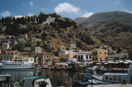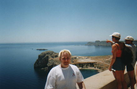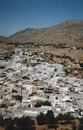 LindosThis is one of the ancient sites on Rhodes. The town has beautiful white-washed winding alleyways, which seemed to consist solely of souvenir clothes shops and blank walls. I took a donkey almost all the way to the top - it told me to get off as we neared the end though, since it was a hot day. The Orthodox (Greek and Russian) way is to celebrate name-days instead of birthdays, so everyone called Paul has a party on St. Paul's day. At least this makes it easy to remember when to get a card for someone! Though I wonder if that is on the Julian (orthodox religious) calendar date or on the modern, Gregorian one... (this calendar change causes confusion with the "October" revolution in Russia for example). |