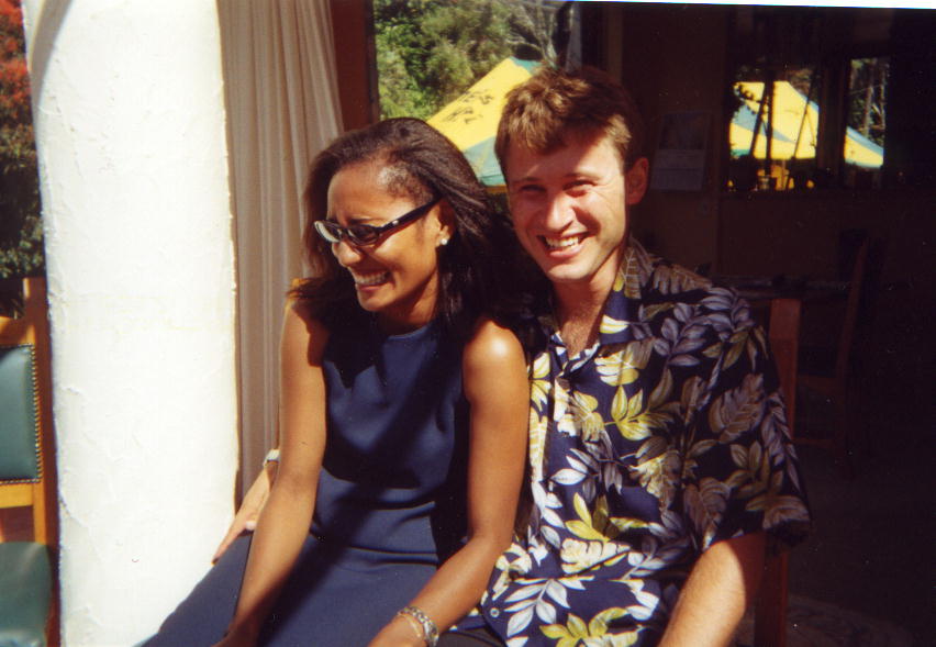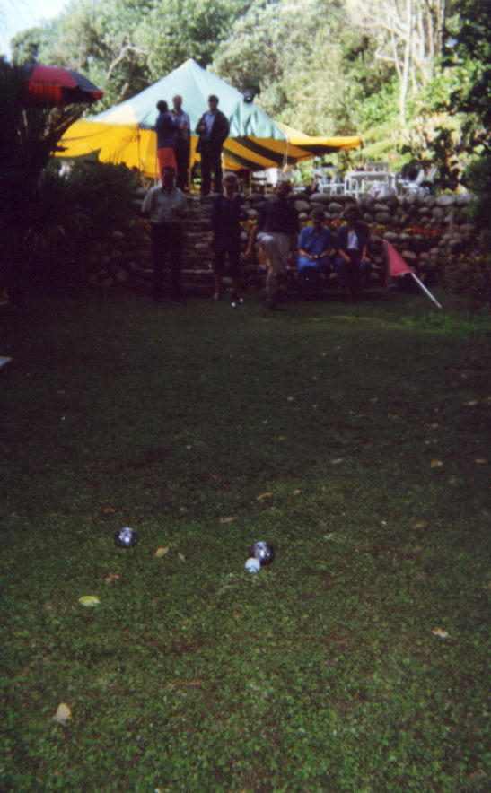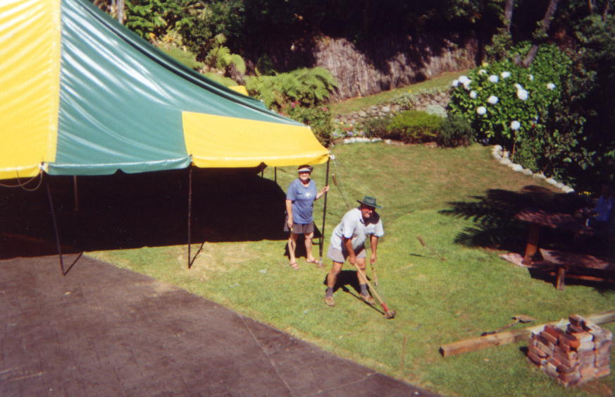 OnaeroThe happy couple almost didn't make it to the reception - Dad had to send a plane up to fetch them. They arrived just before the food was served, which is a good time as far as I am concerned. I "helped" Dad put up the Marquis - the plastic got very hot to the touch in the sun, but once it was up it was OK. We got a roaster and filled it with two sheep. There were no leftovers though - lucky we had those vegetarians along or we would have run short :-) The sea was fine for sailing Dad's Bazooka boat, but I abstained. |